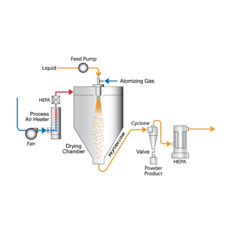روش کار این دستگاه به این صورت است که داخل یک محفظه با حرارت بالا ، مواد پاشیده میشود ، رطوبت آن تبخیر شده و محصول به صورت خشک شده با حداقل رطوبت به دست میآید.