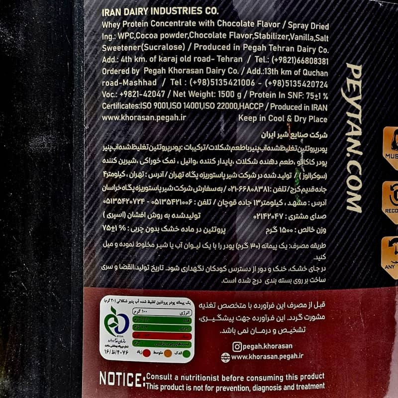 پروتئین وی 100% پگاه خراسان – 1500 گرمی – در دو طعم